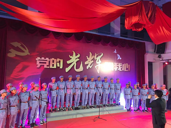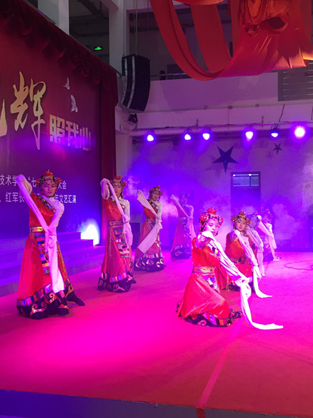 95载风雨兼程,95载艰苦奋斗。壮丽辉煌的《东方红》拉开了演出的帷幕。整场演出分为《序》、《峥嵘岁月》、《红旗飘扬》、《筑梦中国》四个篇章,师生用动情的歌声、优美的舞蹈、绘声绘色的表演抒发对党和国家的无限热爱、对民族复兴的美好憧憬。护理学院的舞蹈《唱支山歌给党听》体现出了群众心中对党的伟大力量的切身感受、对革命无比忠诚的内心表白,八人优美的舞蹈情感丰富,表演深思细腻;《怀念战友》、《保卫黄河》、《大中国》等一首首耳熟能详的革命歌曲把人们的思绪又带回了那个战火纷飞、革命英雄为实现中华民族解放而抛头颅、洒热血的年代,令人激动。舞蹈《十送红军》、《绣红旗》、《红色风采》用古朴生动的表现形式仿佛又带我们回到了当年的磨难国殇,在沉重中飞跃升华,带来特别的艺术感受;建筑系带来的小品《抗日那些事》展示了一名普通的红军战士用坚实的脊梁载负起中华民族无尽的向往,一代又一代前赴后继,赢得了国家的独立和民族的解放;歌曲《春天的故事》则优美动听,展现了亿万人民走在中国特色社会主义大道上的磅礴力量,观众心潮澎湃,掌声如潮;大合唱《走向复兴》激昂唱响,把演出带向高潮,台上光影夺目,台下红旗飘扬,讴歌历史,也在讴歌青春,人们为全面建成小康社会的崭新图景而振奋,为中华民族伟大复兴的中国梦而自豪。最后,在全场包含热情演绎《歌唱祖国》的恢弘乐声中,整场演出落下帷幕。