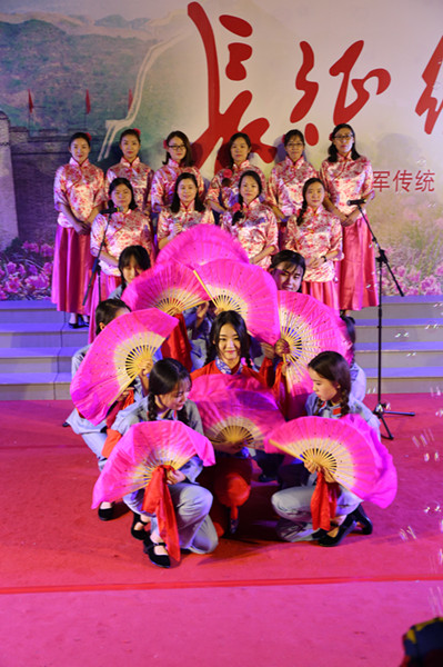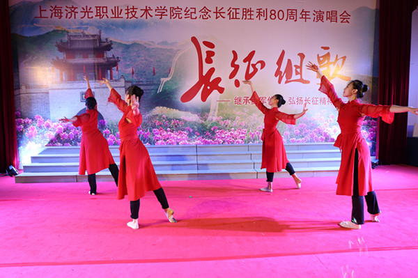 由护理学院带来的《红色娘子军》《红星歌》《十送红军》等节目旋律高亢、振奋人心,第一篇章《突出重围挽救危亡》重温了人类历史上的壮丽里程碑,描述了红军战士坚强不屈的英勇气概。建工系和上海戏剧学院共同演绎的第二篇章《移师遵义拨正航向》再现了长征中的经典战役场面,讴歌了中国革命在困境中顽强自救,走上正确道路的伟大转折,《遵义会议放光芒》、《四渡赤水出奇兵》、《黄河大合唱》的旋律气势磅礴,动人心魄。建筑系带来的第三篇章《历经艰难挥师北上》表达了战士一往无前的崇高精神和老百姓之间浓浓的鱼水情。《军民大生产》、《八路军进行曲》、《映山红》催人奋进、满怀革命主义乐观情怀。《南泥湾》《东方红》、《八月桂花遍地开》构成了昂扬激奋的第四乐章《会师陕北奔赴前方》,机电系的师生以一首首脍炙人口的旋律再现了红军会师的胜利喜悦。由经管系带来的第五篇章《长征精神世代弘扬 》歌颂了伟大的领袖共产党,表达了对祖国的无限祝愿,《太阳最红,毛主席最亲》、《歌唱祖国》将本场晚会推向高潮。