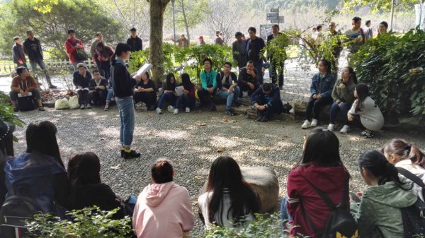 诵读经典分为四部分,分别是郁勇勇同学诵读《道德经》相对论,陈昊同学诵读庄子的《齐物论》,李佳佳诵读《资治通鉴》中的部分内容,陈智远同学诵读元曲《懒人窝》。之后,每位诵读者对其译文和推荐理由进行了解读,其他社员联系实际、结合自身踊跃发言,分享各自的感想与看法。其中石春阳同学和刘�辰同学关于庄周梦蝶中虚实的讨论以及大家对资治通鉴中关于法律引起了讨论热潮。同学们的精彩诵读和发言吸引了过往游客驻足聆听与参与,时而引起阵阵掌声。每一段讨论之后,谢老师都会进行点评并总结。