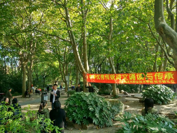 为弘扬中华优秀传统文化,吸引更多的人对中华优秀文化的关注,作为新时期的大学生,悦书明礼社社员决定走出校园,积极传播传统文化。经过前期精心策划,11月5日,悦书明礼社30余名成员在指导老师谢老师的带领下在人民公园举办诵读经典诵读和寓教于乐两项活动。