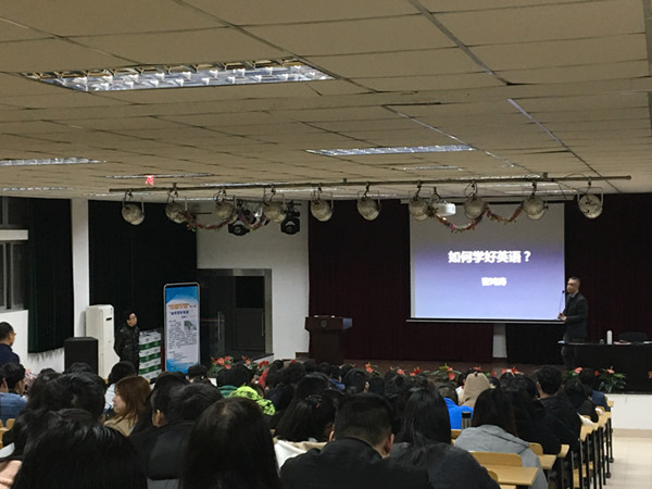 曹博士曾任教新东方,曾主讲美国大学预科课程如AP微积分、AP微观经济学、AP宏观经济学,以及GRE数学、GMAT数学等。多年的学习和从教经历使他对英语学习和应用有着自己独到的见解和经验。讲座中,曹博士从自身经历谈起,分别以态度、坚持与学习三个主题以递进的方式向在场师生娓娓道来,并指出明确自己的态度并坚持学习是学好英语最重要的两点,其次才是学习的方式。最后,曹博士还分享了几款学习英语的软件并与同学们现场互动交流。本次的讲座让同学们重拾了英语学习的信心,同时也给在场学生启迪:能取得成就的人都是通过不断的坚持和学习才换来今日的成就与辉煌。