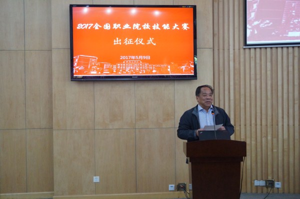 高职学院人才培养的重点是培养学生的实践能力和创新精神,职业技能大赛是提升高职学生创新与实践能力的重要途径。为鼓励我院参赛学生在全国职业院校技能大赛(以下简称国赛)中赛出水平、勇得佳绩,学院于5月9日在圆形会议室为参加国赛的师生举行出征仪式。学院院长李永盛、副院长胡展飞、教务处长陈幼德出席本次出征仪式,实训中心主任徐珺主持。