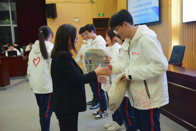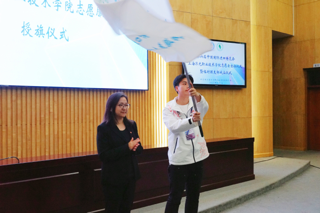 刘丽副书记为志愿者代表授予志愿者出征旗帜并为第六届进博会志愿者代表们赠送志愿者保障物资,标志着44名志愿者将带着学校的期待和祝福踏上助力第六届进博会顺利举行的服务征程。