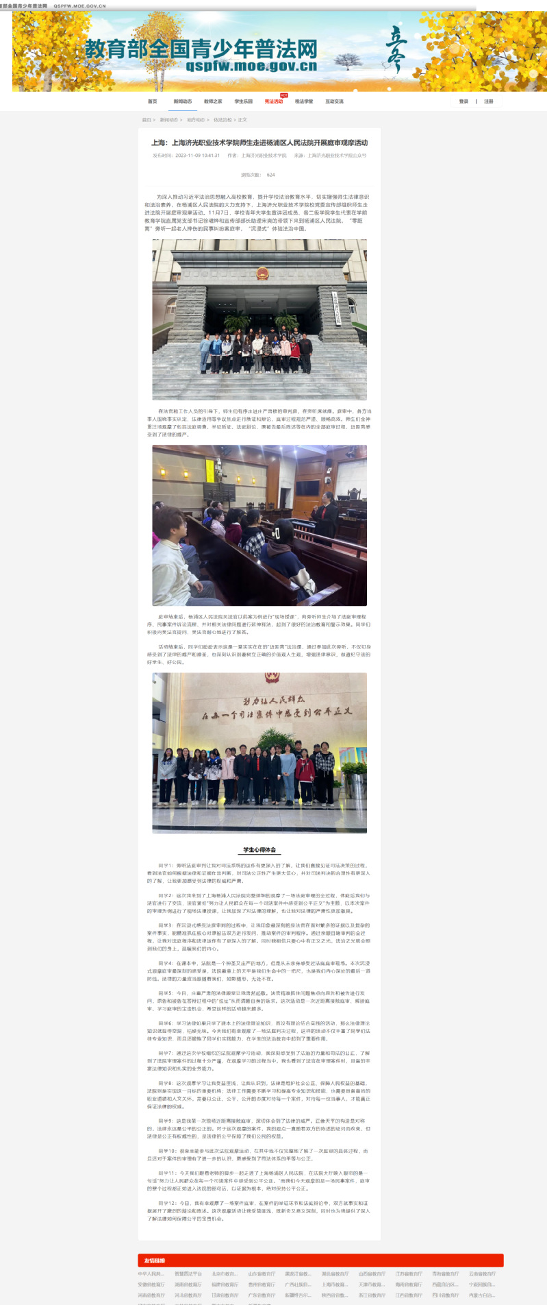 11月9日,经市教委法规处推送,教育部青少年普法网依法治校专栏对我校师生走进杨浦区人民法院开展庭审观摩活动进行了报道。文章链接:https://qspfw.moe.gov.cn/html/lawschool/20231109/20981.html