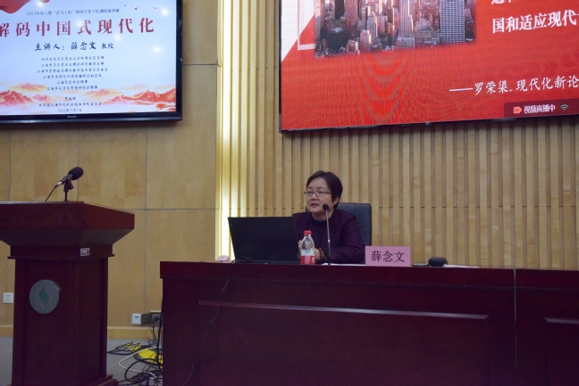 11月7日晚,我校2023年第六期“青马工程”暨团学骨干培训班第四次理论集中学习讲座在圆形会议室举行,本次讲座思政部邀请了同济大学的薛念文教授主讲。薛念文老师是同济大学马克思主义学院教授、博士生导师,上海市马克思主义理论研究教学名师,上海市思想政治理论教学指导委员会思想道德与法治分教学第一届指导委员会委员,上海党史学会理事,上海市毛泽东思想研究会理事。薛教授以“解码中国式现代化”为主题为同学们阐述了中国式现代化的探索历程与基本特征,使青马学员对中国式现代化有了更加深入的了解。思政部教师、本期培训班成员参与聆听,本次课程在雨课堂平台同步直播。