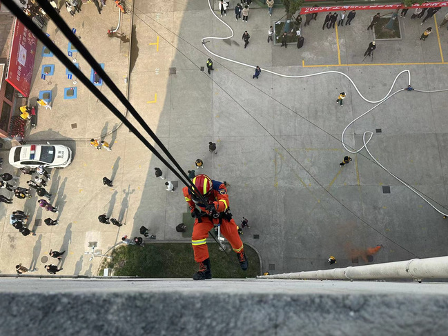 “预防为主、生命至上”,本次消防安全应急演练通过现场实践演练的方式,使全体师生树立了正确的消防观念,提升师生安全防范意识,强化消防知识宣传力度,将安全教育落到实处,维护平安和谐校园。随着校园内响起警报声,参与演练的学生们用毛布捂住口鼻,有序的从安全通道撤离至指定地点,同时消防救援队进行紧急灭火、云梯救援、滑索救援、高空索降等救援项目。随后,演练现场相继进行了反恐救人、急救包扎、灭火器灭火演习等演练项目。