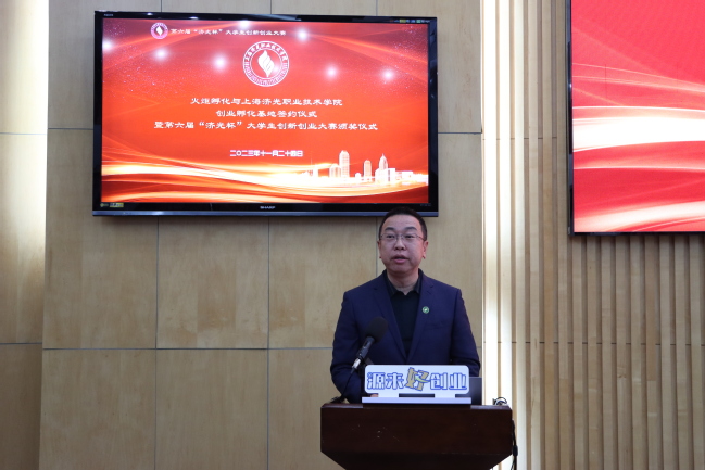 为学习贯彻习近平新时代中国特色社会主义思想和党的二十大精神,落实《国务院办公厅关于进一步支持大学生创新创业的指导意见》,坚持创新引领创业,创业带动就业,支持我校学生提升创新创业能力、增强创新活力,促进学生创业就业。11月24日下午,我校在宝山校区圆形会议室举办第六届“济光杯”大学生创新创业大赛暨校外创业孵化基地签约仪式。我校副校长、大学生创新创业理事会理事长王云飞,副校长孙遥,杨行镇人民政府三级调研员沈惠英,宝山区就业促进中心副主任董海,同济创新创业控股有限公司副总经理高军,上海闿和实业有限公司总经理王轶,学校大学生创新创业理事会成员,学生处(就业指导中心),团委,教务处,各二级学院党政负责人,学生创业项目指导教师及参赛学生等参加活动。