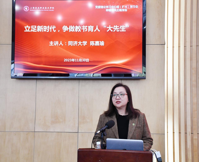 为深入学习贯彻习近平总书记关于师德师风建设的重要论述,强化我校教师思想政治和师德师风建设,夯实高素质师资建设基础,营造风清气正的从教氛围,11月30日下午,学校党委理论学习中心组组织了师德师风专题学习,特邀同济大学生命科学与技术学院陈嘉瑜教授为全体教师作题为《立足新时代,争做教书育人“大先生”》讲座。本次学习会由党委副书记刘丽主持。