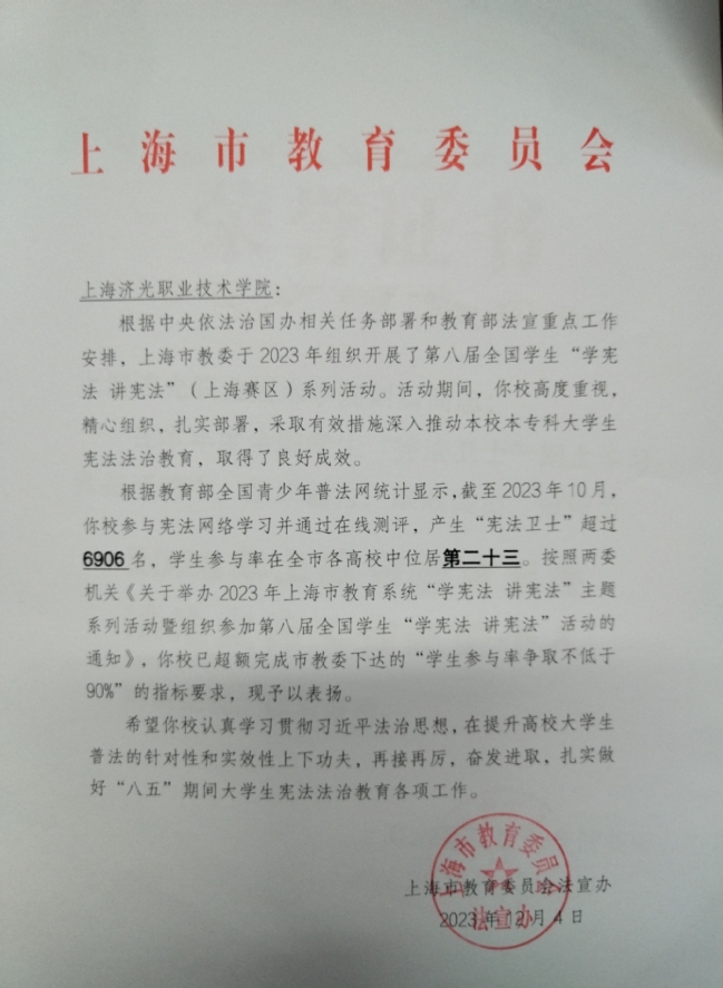 近日,上海市教委法宣办发来表扬信,对学校超额完成市教委下达的学生参与率指标予以表扬,肯定了我校在深入推动大学生宪法法治教育工作中取得的良好成效,并希望学校再接再厉,奋发进取,扎实做好“八五”期间高校大学生宪法法治教育各项工作。