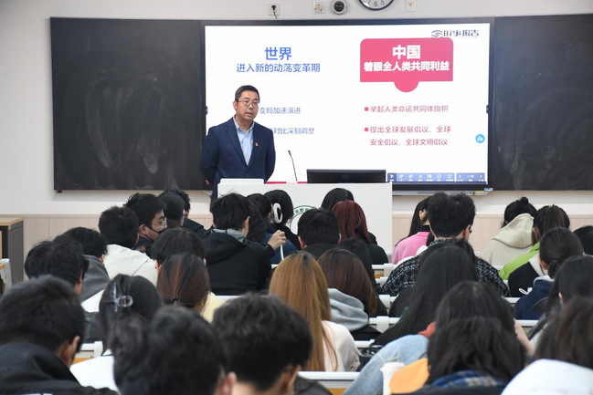 授课过程中,孙遥就当今世界国际局势变革动荡持续演进、大国关系深刻调整、中国智慧彰显担当这三部分内容与学生们展开授课与交流。孙遥分析了当今世界形势变革动荡持续演进的四个表现,全球政治、经济、科技、文化等各个领域的变乱交织。他从三个方面分析了大国关系深刻调整的表现,帮助学生更加深刻地了解认识当前国际形势的复杂性与多变性,增强学生维护国家安全的意识以及实现中华民族伟大复兴的责任感。孙遥从中国提出的三个全球发展、安全、文明这三个倡议的意义和现实价值等,帮助学生更加全面地了解到在这个动荡的时代,中国始终坚定地走在和平发展的道路上,以实际行动为世界和平与发展作出贡献。中国始终坚持互利共赢的开放战略,与世界各国共同应对挑战,推动全球治理体系变革。无论是在应对气候变化、抗击新冠疫情,还是在维护世界和平等方面,中国都展现出了负责任的大国形象。
