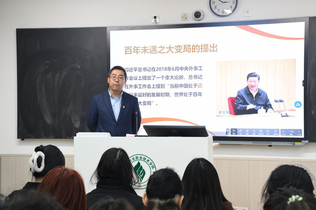 为深入学习贯彻习近平新时代中国特色社会主义思想特别是习近平总书记关于教育与国家安全的重要论述,全面贯彻落实党的二十大精神,系统、及时跟进推动党的创新理论进教材、进课堂、进学生头脑,2023年12月7日,副校长孙遥走进课堂、走上讲台,为学生讲授《世界变乱交织 中国笃行担当》为主题的“形势与政策”课。