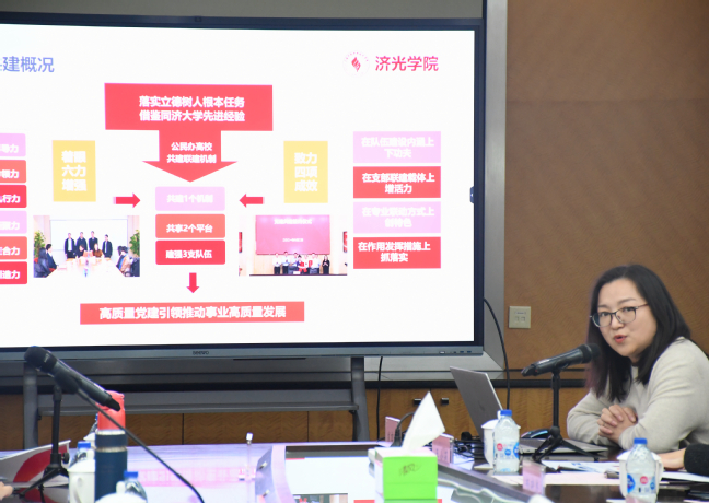 刘丽副书记从“共建情况”“年度进展”“展望未来”三个方面汇报了同济大学与济光学院党建共建推动“三全育人”综合改革工作情况。我校自2018年与同济大学共建以来,积极落实立德树人根本任务,学习借鉴同济大学先进经验,引领学校事业稳步发展,不断增强学校的政治领导力、思想引领力、工作执行力、队伍凝聚力、育人聚合力、自身创造力。接下来,我校将进一步以需求为导向、问题为导向、效果为导向,不断夯实与同济大学的共建合作基础,依托公民办共建来推动学校各项事业高质量发展。