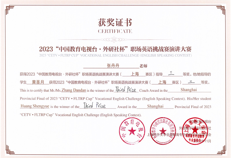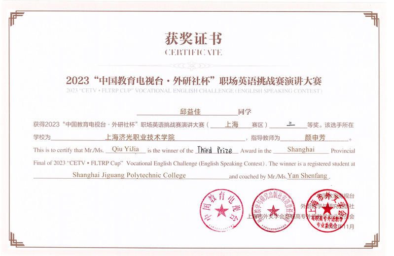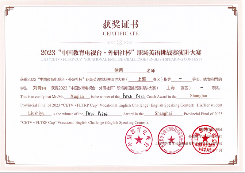 本次比赛不再区分英语专业与非专业,竞争非常激烈。最终经过一天的紧张角逐,来自人工智能学院23级软件技术2班的刘诗雨同学(徐茜老师指导)荣获上海赛区一等奖,来自人工智能学院23级计算机网络技术1班的黄圣月同学(张丹丹老师指导)和来自人居环境与建筑设计学院的22级风景园林设计1班的邱益佳同学(颜申芳老师指导)荣获了三等奖。