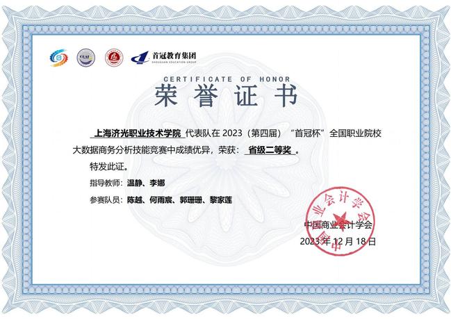 12月9日,由中国商业会计学会主办,河南应用技术职业学院承办,北京首冠教育科技集团有限公司技术支持的2023年第四届“首冠杯”全国职业院校高职组商务数据分析技能大赛在线上成功举办,我校由大数据与会计专业同学组成的济光“这一组”和济光“那一组”两支队伍参赛。