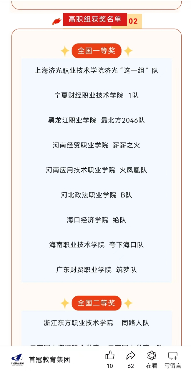 济光“这一组”在老师的指导下,在赛段一大数据商务分析运营竞赛、赛段二PPT制作、商务数据分析汇报、数智化职业素养竞赛以及国赛答辩中,凭借自己丰富的商业思维、分析能力以及沉着出色的表现,成为上海赛区唯一一组入围国赛答辩的队伍,国赛最终成绩位居全国高职组第一名,荣获全国一等奖。