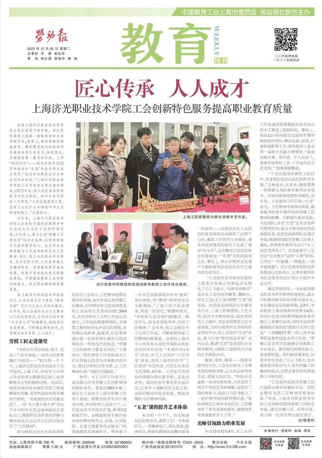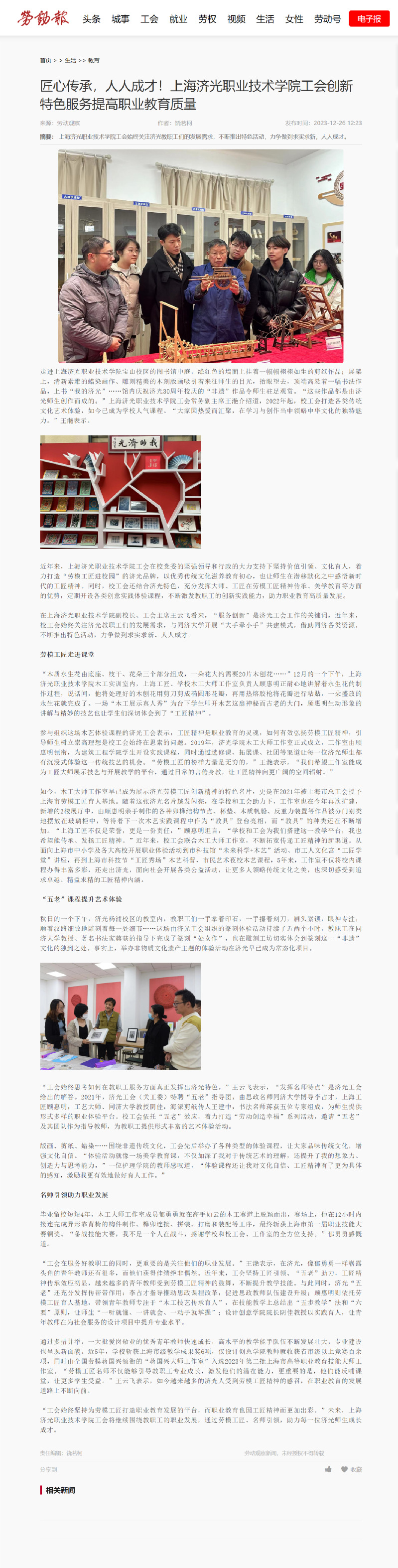12月26日,《劳动报》电子报以《匠心传承,人人成才!上海济光职业技术学院工会创新特色服务提高职业教育质量》为题,深度报道了校工会结合济光特色,充分发挥大师、工匠在劳模工匠精神传承、美学教育等方面的优势,定期开设的各类创意实践体验课程等内容。