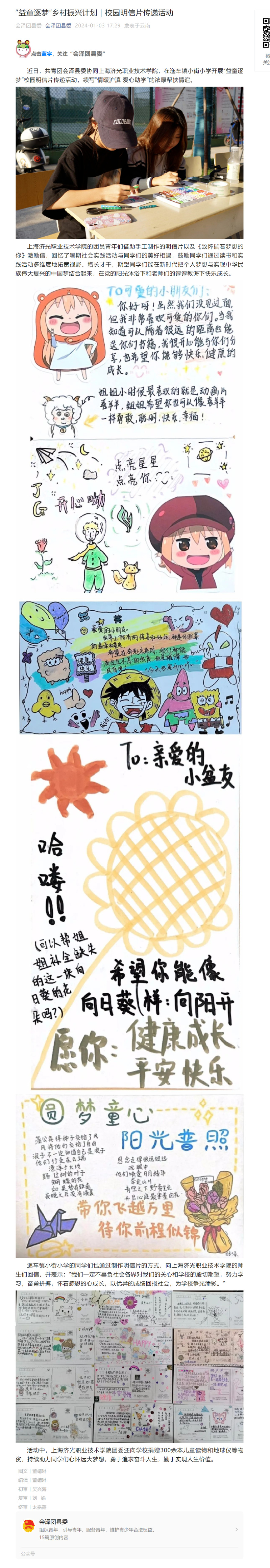 近日,共青团会泽县委协同上海济光职业技术学院,在迤车镇小街小学开展“益童逐梦”校园明信片传递活动,续写“情暖沪滇 爱心助学”的浓厚帮扶情谊。1月3日,共青团会泽县委微信公众号对相关内容进行了专题报道。