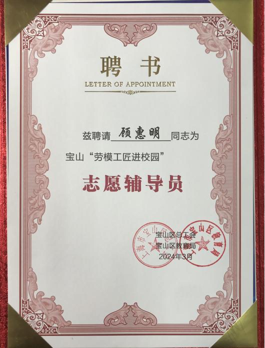 近日,宝山区总工会与宝山区教育局在上海市行知中学启动宝山“劳模工匠进校园”行动。 我校建筑工程顾惠明大师受聘为宝山区“劳模工匠进校园”首批“志愿辅导员”,宝山区人大常委会副主任、区总工会主席顾瑾为劳模工匠们颁发首批“志愿辅导员”聘书。
