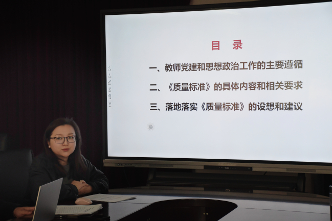 校党委书记姜富明结合当前和未来一段时期学校党委的重点任务,从三个方面对教师党建和思想政治工作进行了强调和部署。一是要认真学习贯彻习近平总书记关于高校党建和思想政治工作的重要论述,从党管人才的政治高度、人才强国的战略高度、立德树人的使命高度,突出党的领导,聚焦指标、效果导向,上下协同、力戒形式主义;二是要坚持以政治建设为统领,不折不扣贯彻落实上级重大决策部署,做好培训解读,准确领悟内涵要求;三是要坚持问题导向、目标导向和效果导向相统一,结合学校实际制定我校工作方案和举措,全面对标对表逐项抓好各项指标的落实,学校章程、相关制度根据要求进行增加、修订相关内容,纳入全面从严治党的责任体系清单。