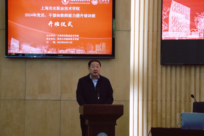 4月19日下午,2024年党员、干部和教师能力提升培训班开班仪式在宝山校区圆形会议室举行。本期培训班共有110名学员,同济大学党委常委、副校长石振明、上海市委党校科社教研部副主任上官酒瑞、我校校领导、校党委理论学习中心组成员、各基层党组织书记及全体培训班学员出席开班仪式。会议由同济大学继续教育学院副院长考书健主持。