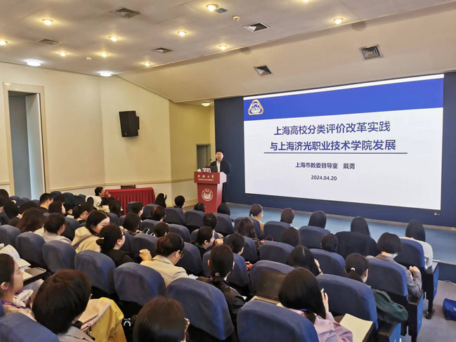 戴勇以《上海高校分类评价改革实践与上海济光职业技术学院发展》为题,结合自身丰富的实践工作经验,从上海高校分类评价改革实践与及我校分类评价表现两个方面出发,进行了详细生动的讲解。报告中,市教委督导室副主任戴勇以分类评价背景为切入点,重点对上海改革实践以及未来方向进行阐述,并结合我校历年得分情况对相关指标进行了详细分析。在我校推动高质量发展的重要时期,戴勇副主任给予了极具针对性和指导性的宝贵建议,他提出要发挥好分类评价指挥棒功能,建立内部评价机制,充分利用同济大学的资源,凝练办学特色,走向高质量发展。