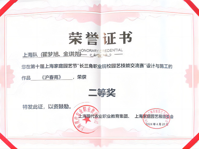 4月19日,由现代农业职教集团主办的第十届上海家庭园艺节“长三角职业院校园艺技能交流赛”在上海梦花源上房园艺成功开赛。人居环境与建筑设计学院的2022级环境艺术设计专业学生金琪尧和翟梦旭的作品《沪春园》荣获设计与施工赛项的二等奖。