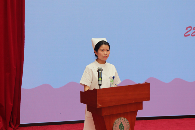 2022级护理8班徐溯代表全体学生感谢各位老师们的祝福和嘱咐,表达了对护理事业的热爱,及为之奋斗终身的决心与毅力
