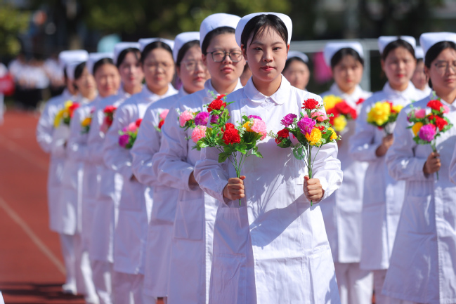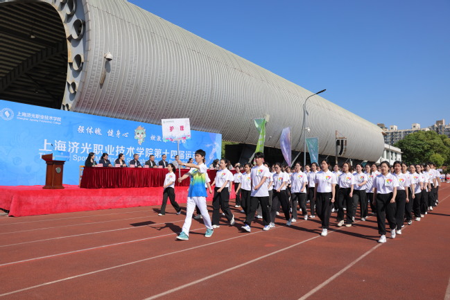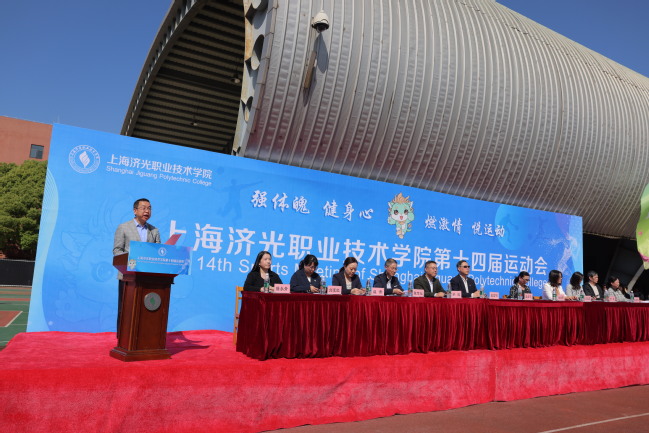 在开幕式上,国旗班仪仗队、护理学院的鲜花队、多个学院组成的红旗方队,各专业学生运动员代表队、各教工代表队依次入场,高喊口号,动作整齐划一,展示了饱满的热情。紧接着进行广播操比赛,全体师生精神饱满、队列整齐、动作规范,广播操比赛后的啦啦操表演更是极具观赏性,充分展示了我校学生斗志昂扬、积极向上的精神风貌。在庄严的升旗仪式后,校党委书记姜富明宣布上海济光职业技术学院第十四届运动会开幕。
