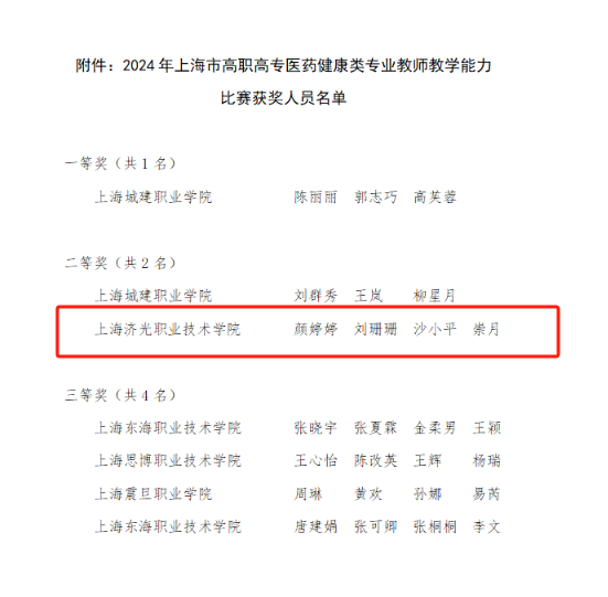 5月10日,上海市高职高专医药健康类教师教学能力比赛在上海城建学院静安校区拉开帷幕,本次大赛共有来自5所院校的8支教师团队参赛,7支队伍进入现场赛环节。由我校护理学院颜婷婷、刘珊珊、沙小平、崇月4名教师组成的基础护理教学团队,凭借着扎实的教学功底和卓越的教学设计,在一众参赛队伍中脱颖而出,荣获了二等奖。