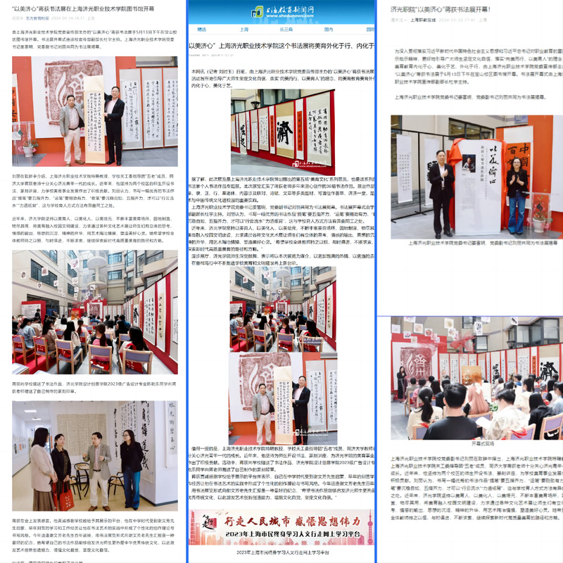 由校党委宣传部主办的“以美济心”蒋荻书法展于5月13日下午在宝山校区图书馆开幕。《东方教育时报》5月15日以《“以美济心”蒋荻书法展在上海济光职业技术学院图书馆开幕》为题,上海教育新闻网5月17日以《“以美济心”上海济光职业技术学院这个书法展将美育外化于行、内化于心》为题,上海职教在线5月20日以《济光职院“以美济心”蒋荻书法展开幕!》为题分别对我校“以美济心”蒋荻书法展开幕进行了专题报道。