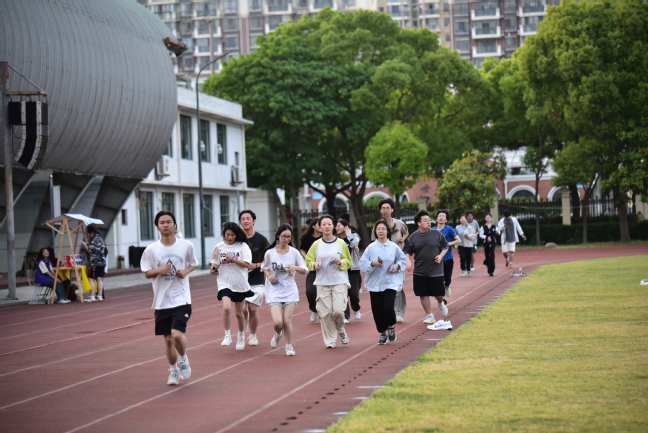 活动现场热闹非凡,每一位参与者的脸上都挂满了笑容。跑道上的学子们或快步疾行,或悠然自得,用自己的方式诠释着运动的魅力。跑道两旁的学生志愿者们也为他们加油助威,掌声、欢呼声此起彼伏,现场气氛热烈而温馨。