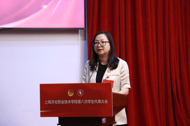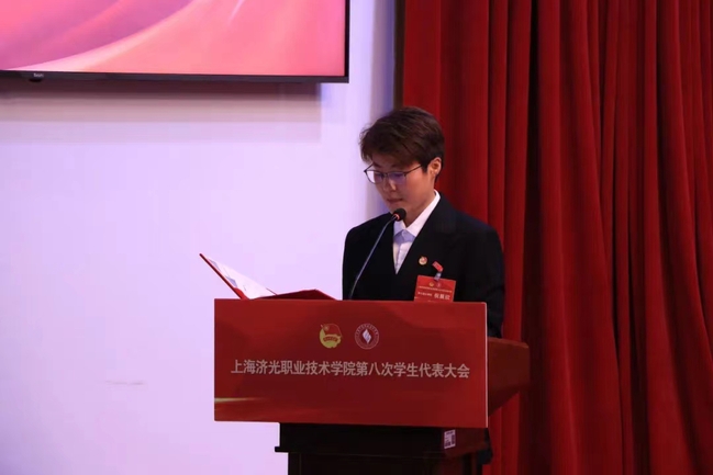 第七届校学生会执行主席顾尤嘉代表上海济光职业技术学院第七届学生委员会作了题为《以习近平新时代中国特色社会主义思想为指引在竞逐新质生产力中展现“新生代”担当》的工作报告。通过回顾思想引领、权益维护、文化建设等方面的成果,明确下一步学生会工作的总体规划,她表示,我校学生会将在“求实求新 人人成才”的校训指引下,在“同舟共济 公益办学 自强不息 追求卓越”的济光精神熏陶下,厚植家国情怀,心存高远之志,勇担时代使命,始终牢记初心使命,立足思想引领之主线,倾听同学需求,让服务贴近贴切;立足时代社会之所需,推进改革创新,在发展中追求卓越;立足爱校爱国之情怀,展现青春风采,凝聚青春力量,团结带领广大同学牢记青春使命,以青春之我奋力谱写全面建设社会主义现代化国家更加绚丽的华章。