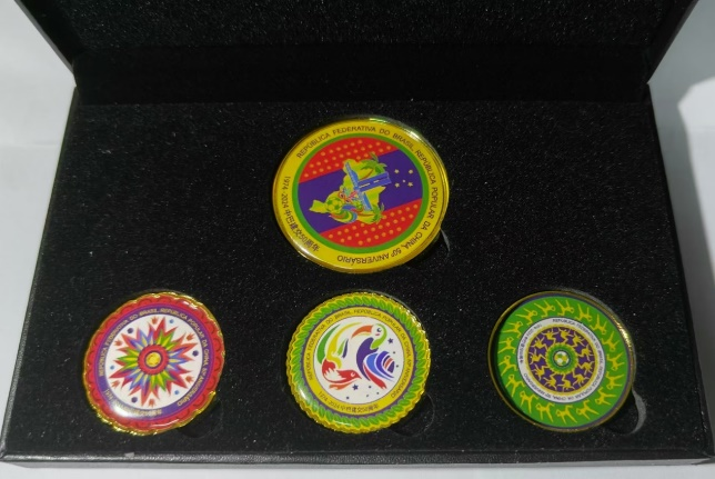 作为纪念徽章的主创设计,孙俪老师为介绍了纪念徽章的设计思路。她介绍道,本届徽章是由济光学院设计创意学院徽章设计团队创作,主徽章设计以中国传统宫殿大门与典型的巴西元素构成,象征着中巴之间的友谊与交流;敞开着的恢宏宫门代表着中国悠久历史和热情容纳,而巴西元素则展示了经典的丰富资源、文化和体育;天空中共同闪耀的五颗星星取自巴西国徽和中国国旗,象征着两国建交五十年历程。三个小徽章则分别体现了自然、能源和激情三个不同主题,也寓意着未来两国经济和文化发展的方向。