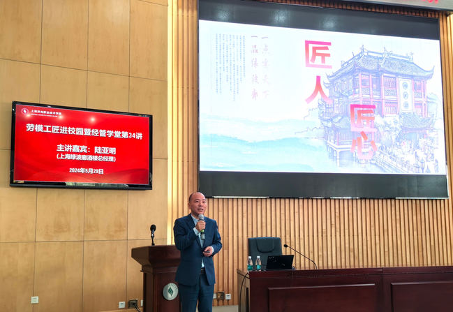 5月29日下午,在校工会(关工委)的大力支持下,《经管讲堂》第三十四讲、“劳模工匠进校园”宣讲活动在圆形会议室开讲。上海绿波廊酒楼总经理、全国五一劳动奖章获得者、全国技术能手、享受国务院特殊津贴专家、上海市技能大师工作室带头人、上海工匠陆亚明大师,以“上海点心的创新发展”为题,结合中式面点的技艺传承,为酒店管理与数字化运营专业全体师生带来了一场别开生面的匠人匠心专题学习。