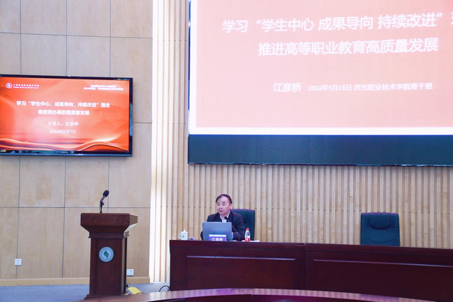 为进一步落实立德树人根本任务,提升我校教育教学质量,6月7日下午,在圆形会议室举行校党委理论学习中心组学习会,上海市民办教育协会副会长、秘书长江彦桥应邀来校作《学习“学生中心 成果导向 持续改进”理念,推进高等职业教育高质量发展》专题辅导报告。我校校领导、校党委理论学习中心组成员、党政中层干部、各专业主任以及全体培训班学员聆听学习。报告由党委副书记刘丽主持。