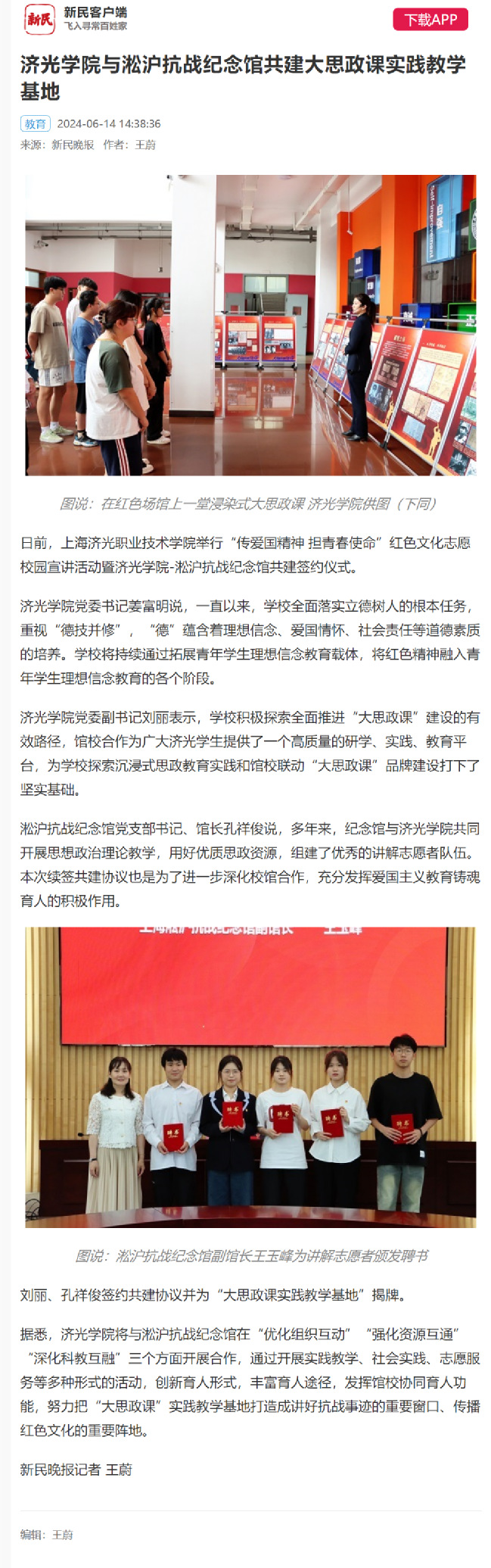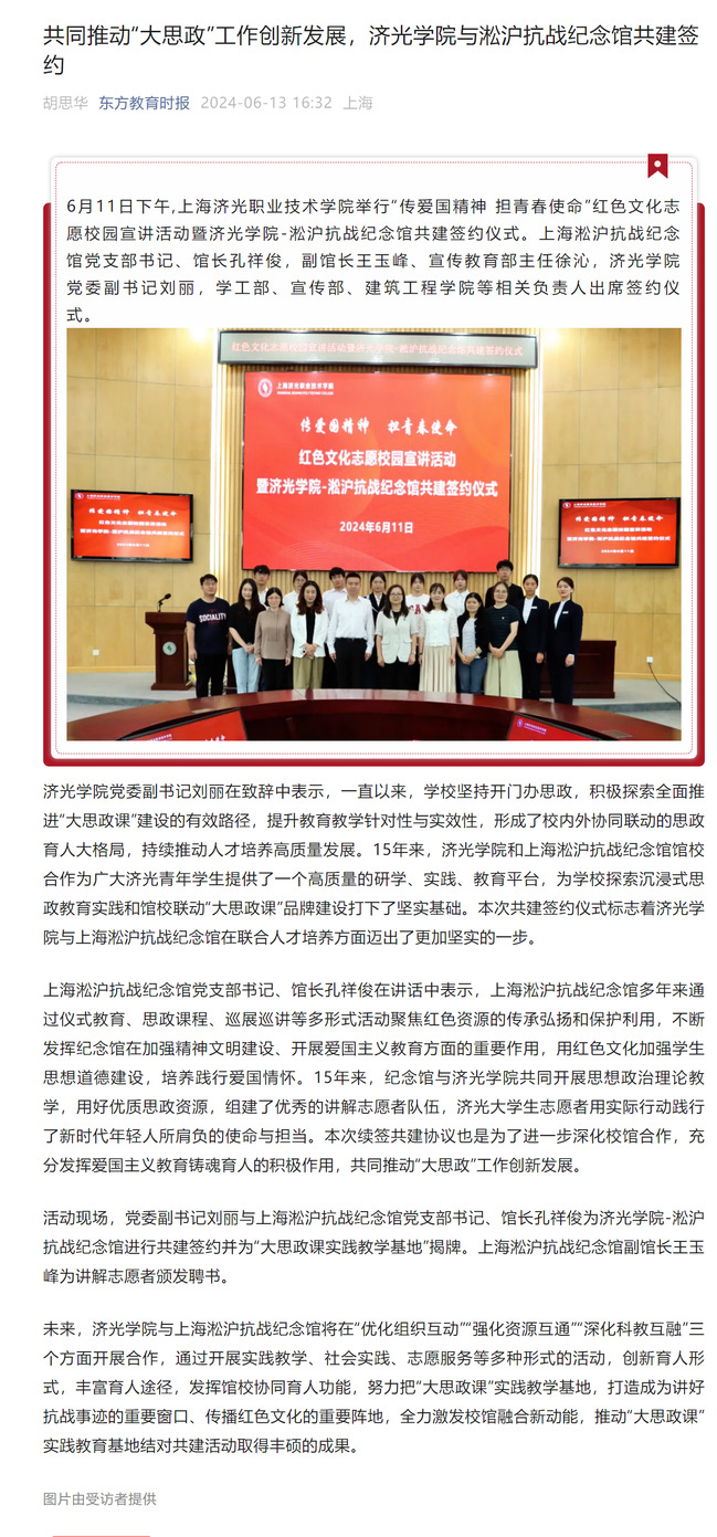 6月13日,《东方教育时报》以《共同推动“大思政”工作创新发展,济光学院与淞沪抗战纪念馆共建签约》;6月14日,《新民晚报 》客户端以《济光学院与淞沪抗战纪念馆共建大思政课实践教学基地》为题专题报道了我校与淞沪抗战纪念馆开展大思政课实践教学基地共建签约仪式。