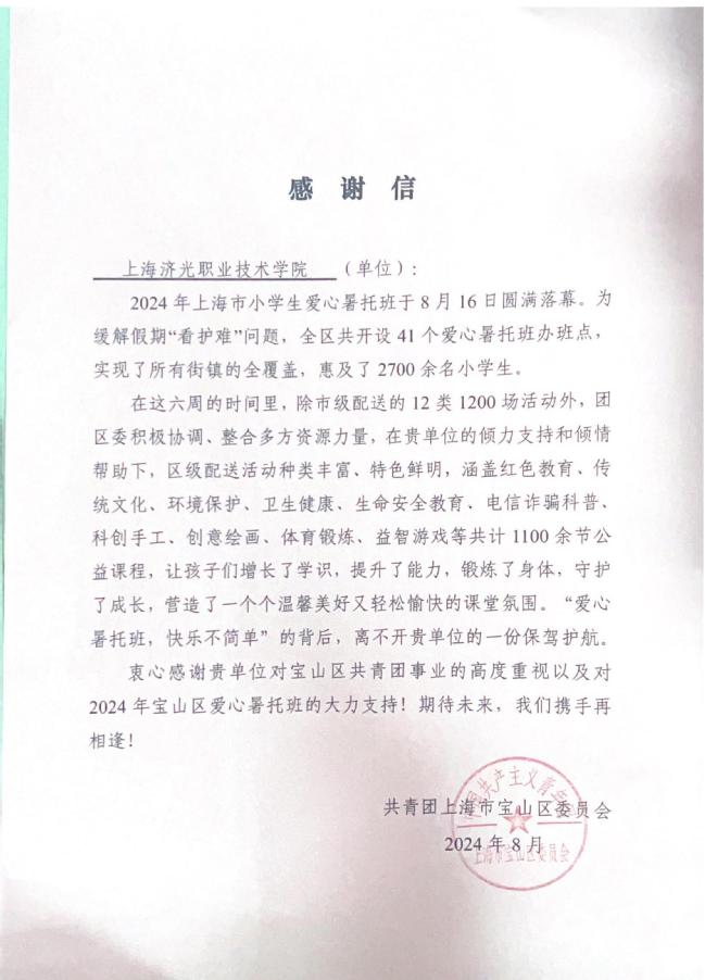近日,随着2024年上海市爱心暑托班的圆满落幕,共青团上海市宝山区委员会发来感谢信,向我校积极配合爱心暑托班工作致以诚挚的感谢。