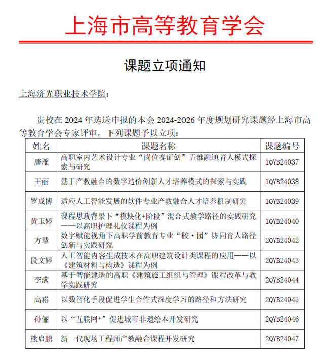 7月10日,上海市高等教育学会发布了2024-2026年度规划研究课题立项通知。经由各学院(部)择优推荐,科研处组织校内外专家对申报书进行指导和严格评审后报学会,经上海市高等教育学会专家评审,我校有10个课题被批准立项。