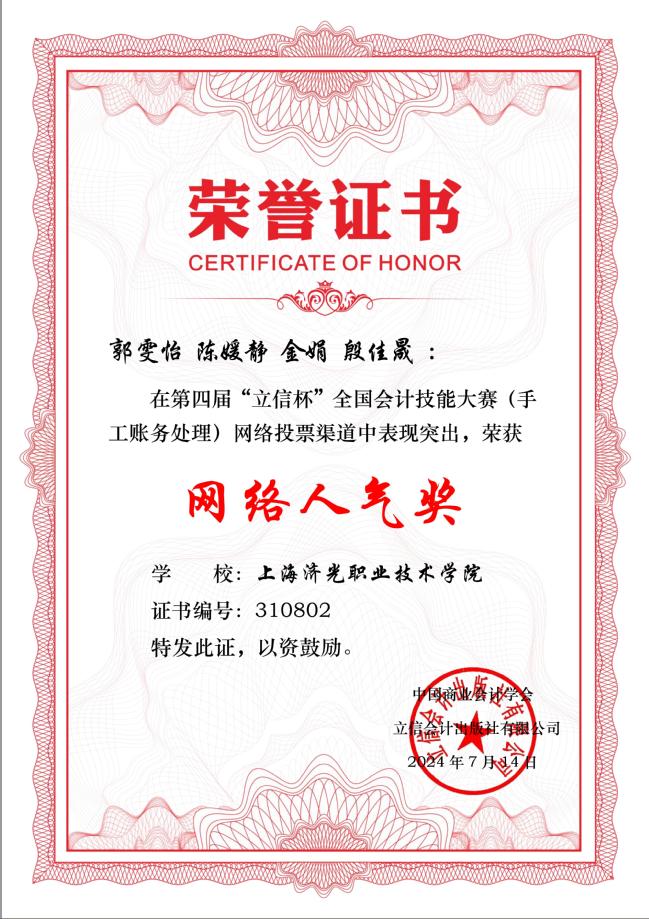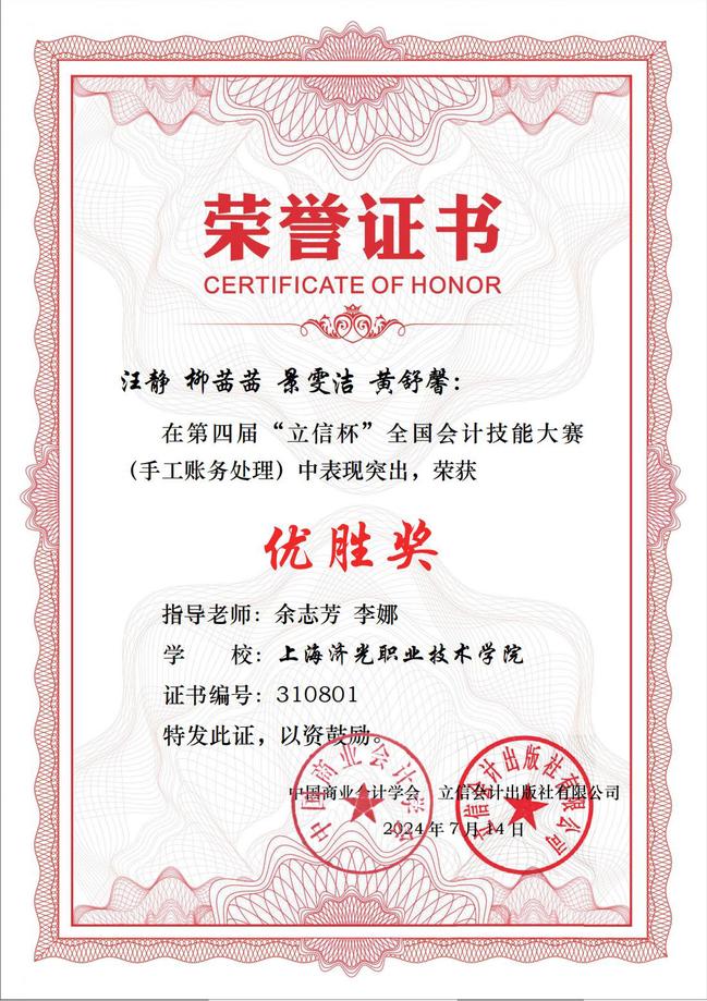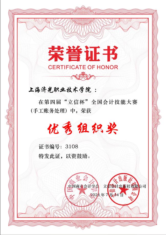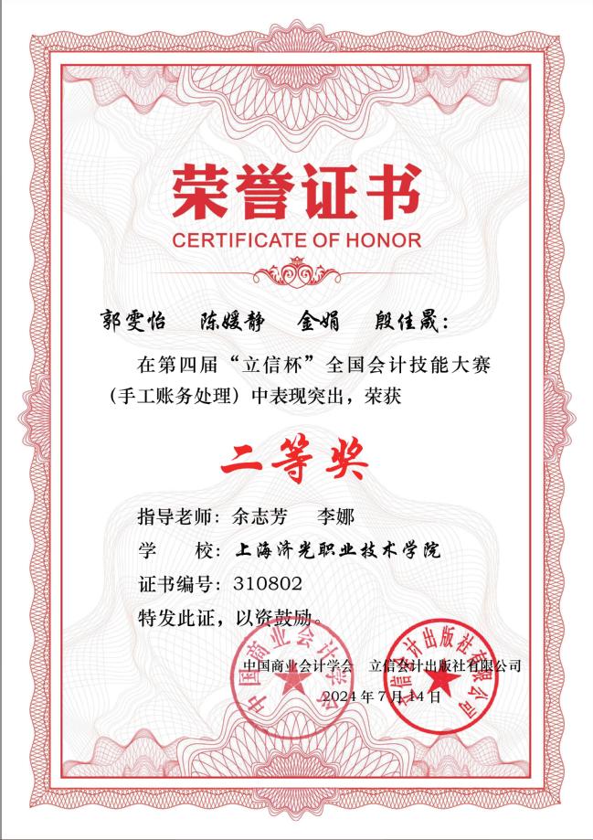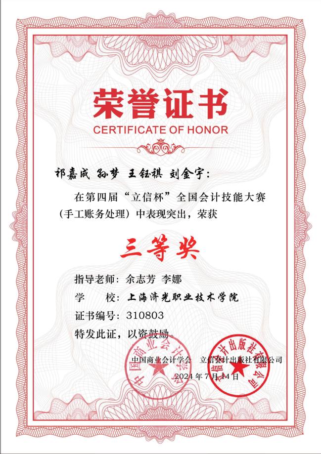 2024年7月,由中国商业会计学会主办、立信会计出版社承办的第四届“立信杯”全国会计技能大赛(手工账务处理)在上海立信会计金融学院顺利举办。第四届“立信杯”全国会计技能大赛(手工账务处理)共计报名院校323所,收到学生作品789组。经过大赛专家的评审,我校经济管理学院大数据与会计专业2022级学生郭雯怡、陈媛静、金娟、殷佳晟团体二等奖、网络人气奖,2022级学生祁嘉成、孙梦、王钰祺、刘金宇获团队获三等奖,22级学生汪静、柳茜茜、景雯洁、黄舒馨获优胜奖,我校荣获优秀组织院校奖。