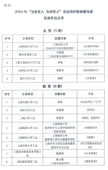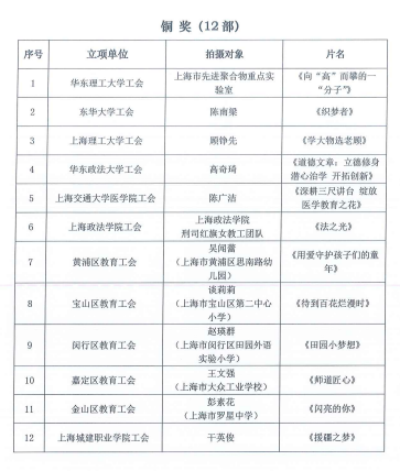本次入围微电影决赛的作品共25部,经专家组评定,优秀作品金奖5部,银奖8部,铜奖12部。每一部作品都展示了上海教师饱满高昂的精神面貌,默默耕耘的奉献精神,激励着广大教育工作者不忘育人初心、牢记树人使命,积极投身“为党育人 为国育才”的崇尚事业。,所有获奖作品将上报市总工会,参与第八届职工微电影节的评选,同时将在上海教育电视台进行展播。