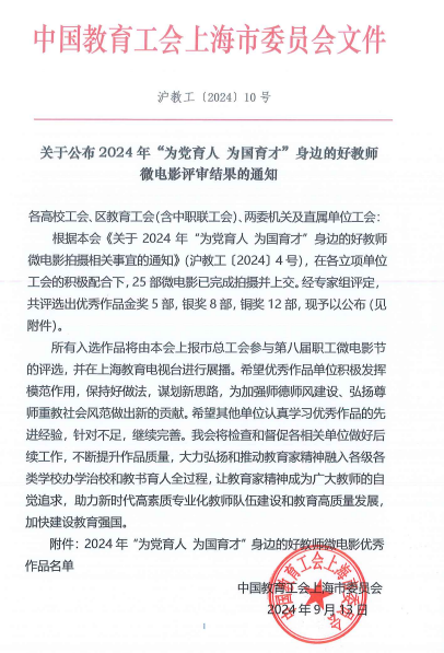 近日,2024上海市教育工会“为党育人 为国育才”身边的好教师微电影评审结果出炉,由我校工会报送的《与木同承》获得银奖。