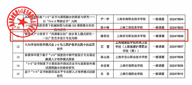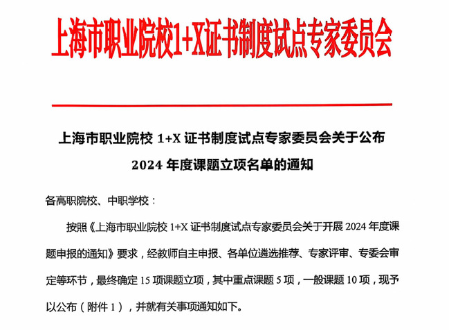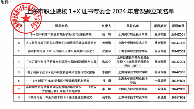 根据《上海市职业院校1+X证书制度试点专家委员会关于公布2024年度课题立项名单的通知》,我校经济管理学院李娜、设计创意学院潘思佳的课题均获批准立项。