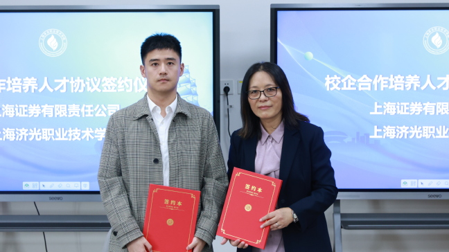 校企合作培养人才协议签约仪式上,上海证券有限责任公司高级顾问胡涛与经管学院院长张迺英教授共同签署了《校企合作培养人才协议书》,校企将在培养“证券经纪人”人才方面进行共同探索和实践。