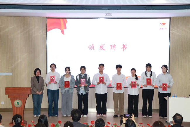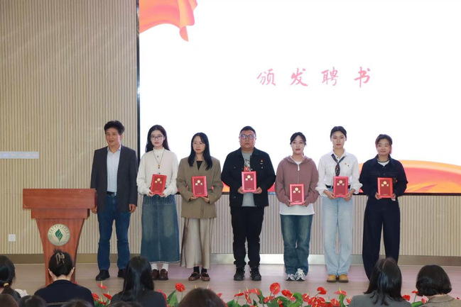 杨小勇教授为各学院指导老师颁发聘书,毛燕静老师为各学院青马学生组长颁发聘书。