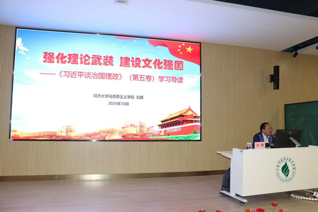 同济大学马克思主义学院副院长刘勇教授为济光师生讲授本期学习班的第一课,主题为《强化理论武装 建设文化强国——〈习近平谈治国理政〉(第5卷)学习导读》。刘勇教授是现任同济大学马克思主义学院副院长,教授,博士生导师。兼任中央马克思主义理论研究和建设工程专家组主要成员,全国高校中青年马克思主义学者论坛召集人,中国历史唯物主义学会理事,中国国际共产主义运动史学会理事,中国列宁思想研究会常务理事,全国马克思列宁主义经济学说史学会理事,上海马克思主义研究会理事。主持中央马工程特别委托项目子课题、国家社科基金重大招标课题子课题、国家社科基金、省部级课题20多项。长期从事马克思主义理论本硕博专业和思想政治理论课教学,荣获全国高校优秀中青年思想政治理论课教师择优资助计划人选,全国高校思想政治理论课“教学标兵”,全国高校思想政治理论课教师“影响力提名人物”,上海市高校思想政治理论课名师工作室主持人,入选全国高校优秀思想政治理论课示范课百人巡讲团成员。2019年3月18日参加了习近平总书记主持召开的学校思想政治理论课教师座谈会,被学习强国、教育部网站和《中国教育报》头版头条报道,被誉为思想政治理论课“大满贯”教师。