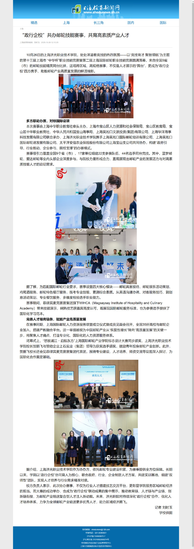 10月28日,上海教育新闻网以《“政行企校”共办邮轮技能赛事,共育高素质产业人才》为题对我校开展的邮轮技能赛事进行了综合性报道。