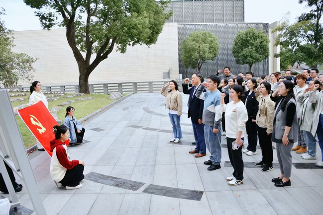 参观活动结束后,淞沪抗战纪念馆内所蕴含的厚重历史氛围,依旧萦绕于每一位党员的心头。这种对革命先烈的崇高崇敬、对历史的深切敬畏之情,为即将开展的重温入党誓词仪式奠定了深沉且庄严的情感基础。在机关党总支书记李仪君同志的带领下,全体党员面向鲜红的党旗,庄严举起右拳,以铿锵有力的声音再次许下对党的忠诚誓言。激昂的宣誓声回荡在现场,这既是一次深刻的精神洗礼,更是一次有力的思想动员。