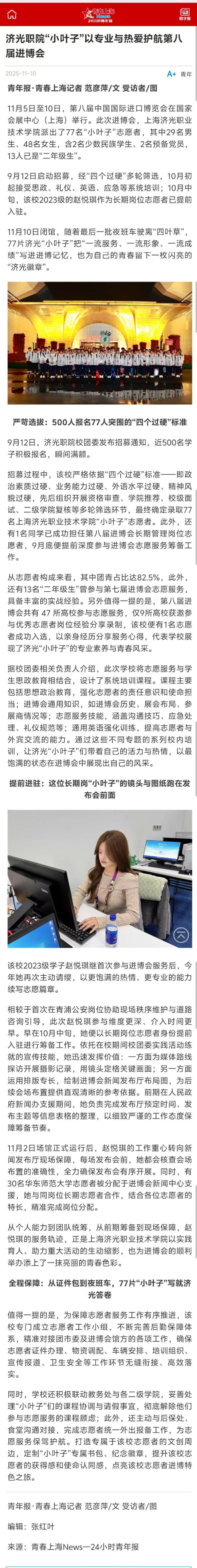 2025年11月10日,“青春上海”客户端以“济光职院‘小叶子’以专业与热爱护航第八届进博会”为题,报道了我校“小叶子”志愿者服务第八届进博会的故事。