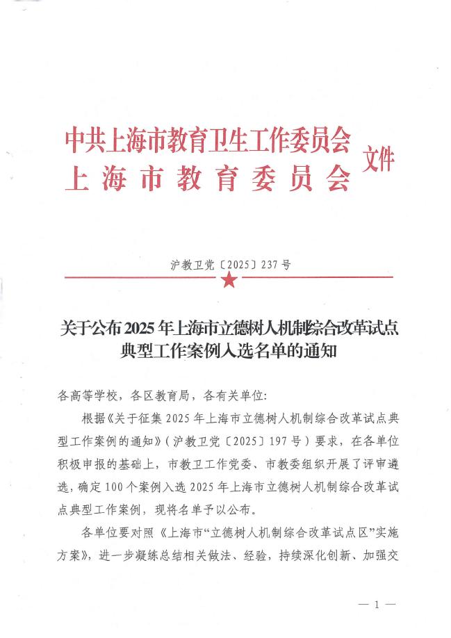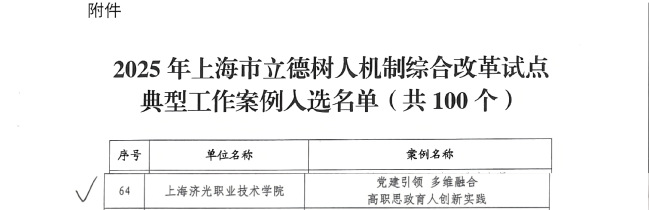 近日,我校经济管理学院申报的《党建引领多维融合高职思政育人创新实践》案例成功入选2025年上海市立德树人机制综合改革试点典型工作案例,成为全市100个典型工作案例之一。