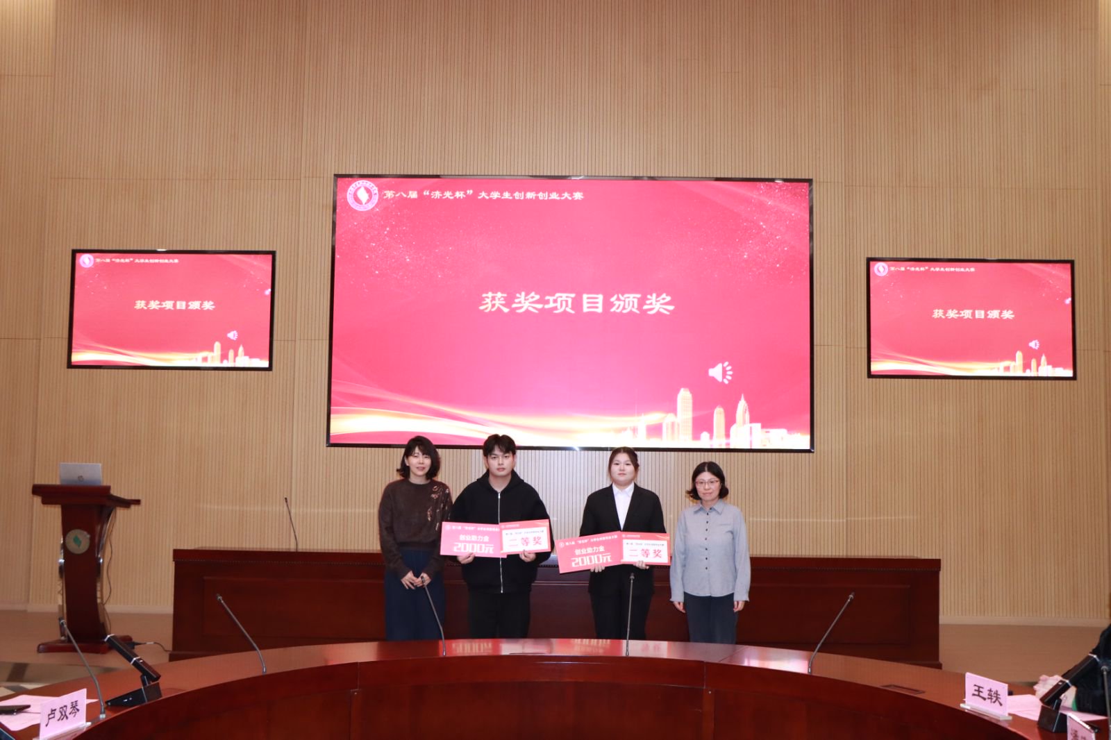 学校领导和宝山区领导、杨行镇领导、合作单位领导为学生项目团队负责人颁奖。王云飞副校长为新聘的4位创业导师、1位续聘导师颁发了聘书。宝山区就业促进中心领导、校内外马兰花导师分别为我校马兰花培训(SYB)学员代表、马兰花培训(SYB)优秀学员、马兰花培训(SYB)优秀助教颁发证书。
